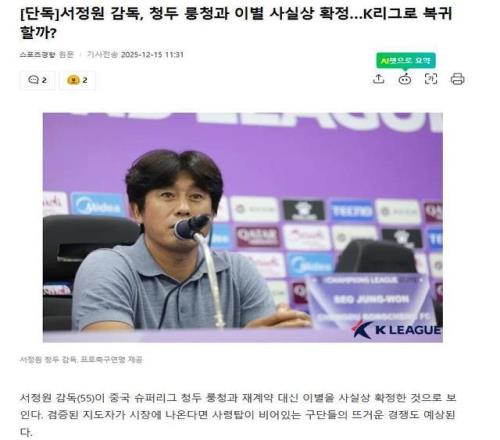 这绝对是中国足球的巨大损失,根据韩国记者黄敏国今天的最新爆料,成都蓉城的韩国名帅徐正源与球队谈判破裂,徐正源已返回韩国,而且终止了续约谈判,目前倾向于和平分手,而他想要回韩国先休息一段时间,3家韩国豪门有望成为他的下家!